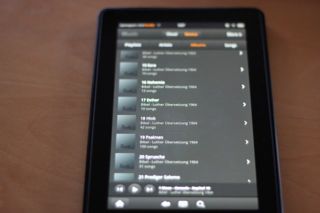 Jedenfalls hab ich mir mal komplett meine Audiobibel (Luther 1956/64) auf den Kindle Fire kopiert, die ich bei entsprechender Ansicht (und richtig gestalteten Datei-Details bzgl. Autor, Album etc. ) sehr komfortabel anwählen und hören kann. Der Kindle-Fire verfügt über 8GigaByte an internem Speicher, von denen gut 5 Gigabyte zur freien Verfügung stehen.