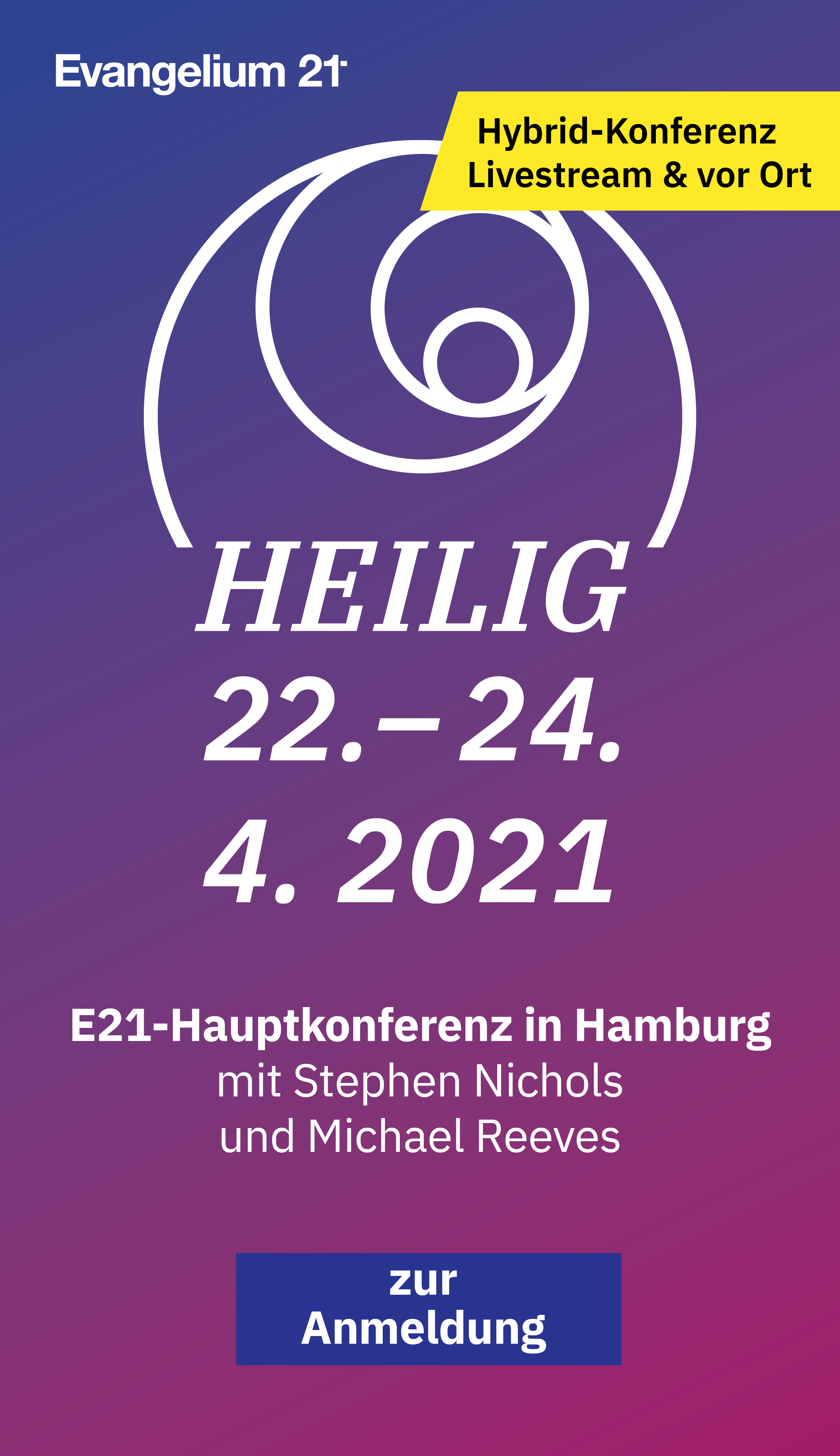 Die letzte große Evangelium 21-Konferenz fand im Herbst 2019 statt. Jetzt steht wieder eine Konferenz an. Gastredner sind dieses Mal Dr. Stephen Nichols und Dr. Michael Reeves. Das Thema der Konferenz lautet: „HEILIG“. Vom 22. bis 24.4. findet die Konferenz statt. Das Programm und die geplanten Vorträge können eingesehen werden. Es soll sich um eine Hybrid-Konferenz handeln. Das meint, ein Teil der Teilnehmer wäre vor Ort und ein anderer Teil nimmt online an der Konferenz teil. Klar dürfte jetzt bereits sein, sofern die Konferenz überhaupt mit Teilnehmern stattfinden kann, dass die Teilnehmerzahl eingeschränkt sein wird. Man kann sich anmelden. Online kann man an der Konferenz sicher teilnehmen. Wer sich anmeldet, könnte – sofern Teilnehmer erlaubt sind – einen Platz vor Ort in Hamburg erhalten.
